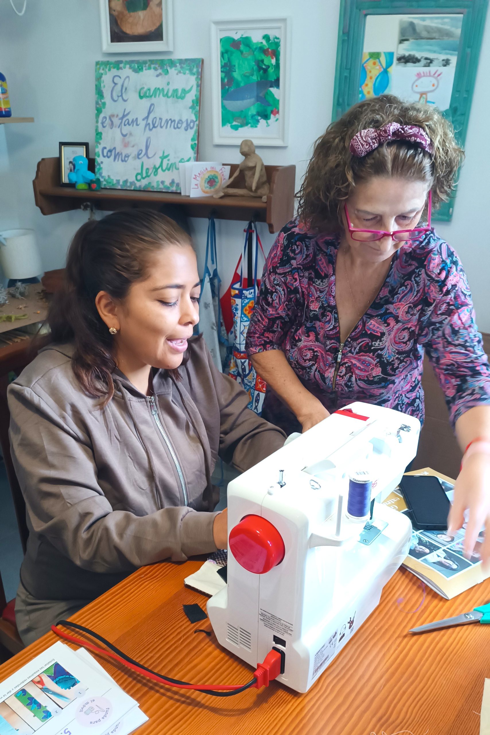 Cada viernes nos encontramos para coser y tejer juntas. Cada persona tiene la oportunidad de crear bolsos, complementos y accesorios a su medida.